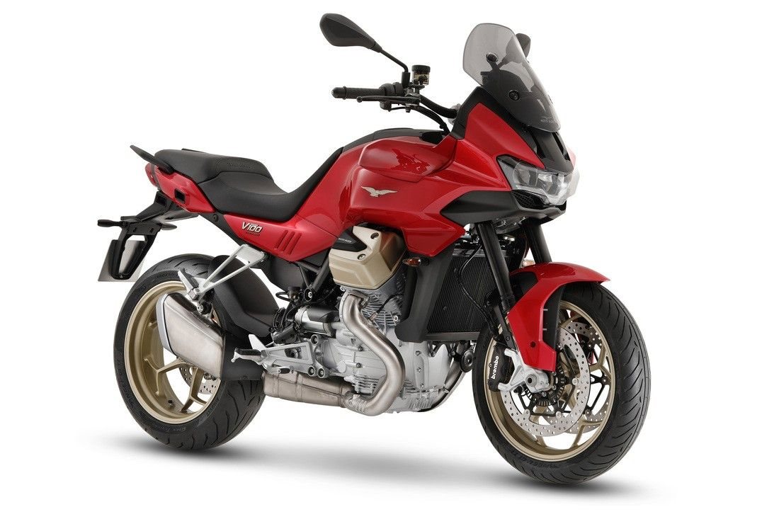 Die V100 Mandello ist die erste Moto Guzzi, die von dem neuen "Compact-Block"-Motor angetrieben wird. Traditionell präsentiert sich der Motor als längseingebauter 90°-V2, bei der V100 Mandello erstmals mit Flüssigkeitskühlung und hydraulisch betätigter Mehrscheiben-Ölbad-Kupplung. Leichter, kompakter und um 103 mm kürzer als der "Small Block" der V85 TT präsentiert sich der 1.042 cm V2-Motor mit satten 115 PS bei 8.800 U/min und 105 Nm Drehmoment bei 6.750 U/min.