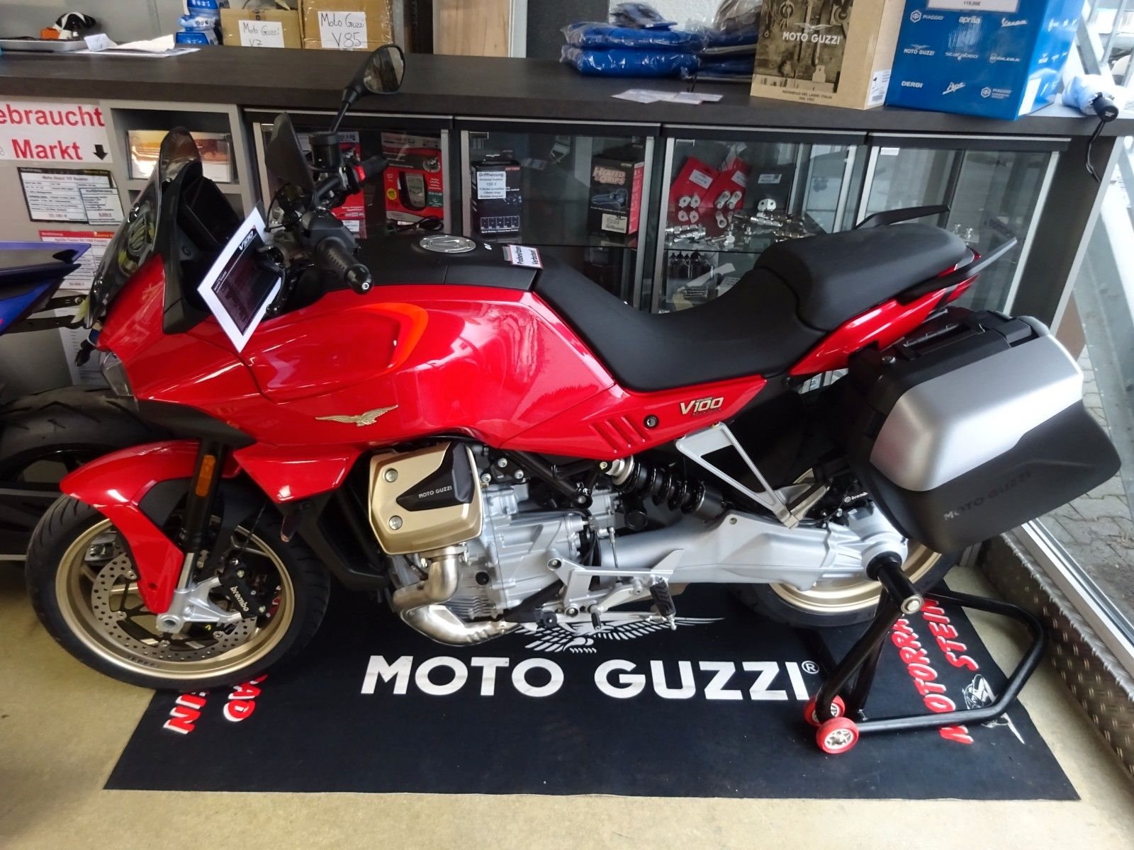 Sind Sie bereit für ein vollkommen neues Kapitel Motorradgeschichte?Die V100 Mandello ist die perfekte Symbiose zwischen den dynamischen Qualitäten eines Roadsters und dem Komfort eines vollwertigen Tourers. Sie lässt jede Kurve zu einem Hochgenuss werden und garantiert Fahrer und Beifahrer auch auf langen Touren ein Höchstmaß an Komfort. On top bietet die V100 eine Vielzahl neuester Technologien, wie das bisher einzigartige adaptive Aerodynamiksystem, die einen einzigartigen Schritt in die Zukunft ankündigen.