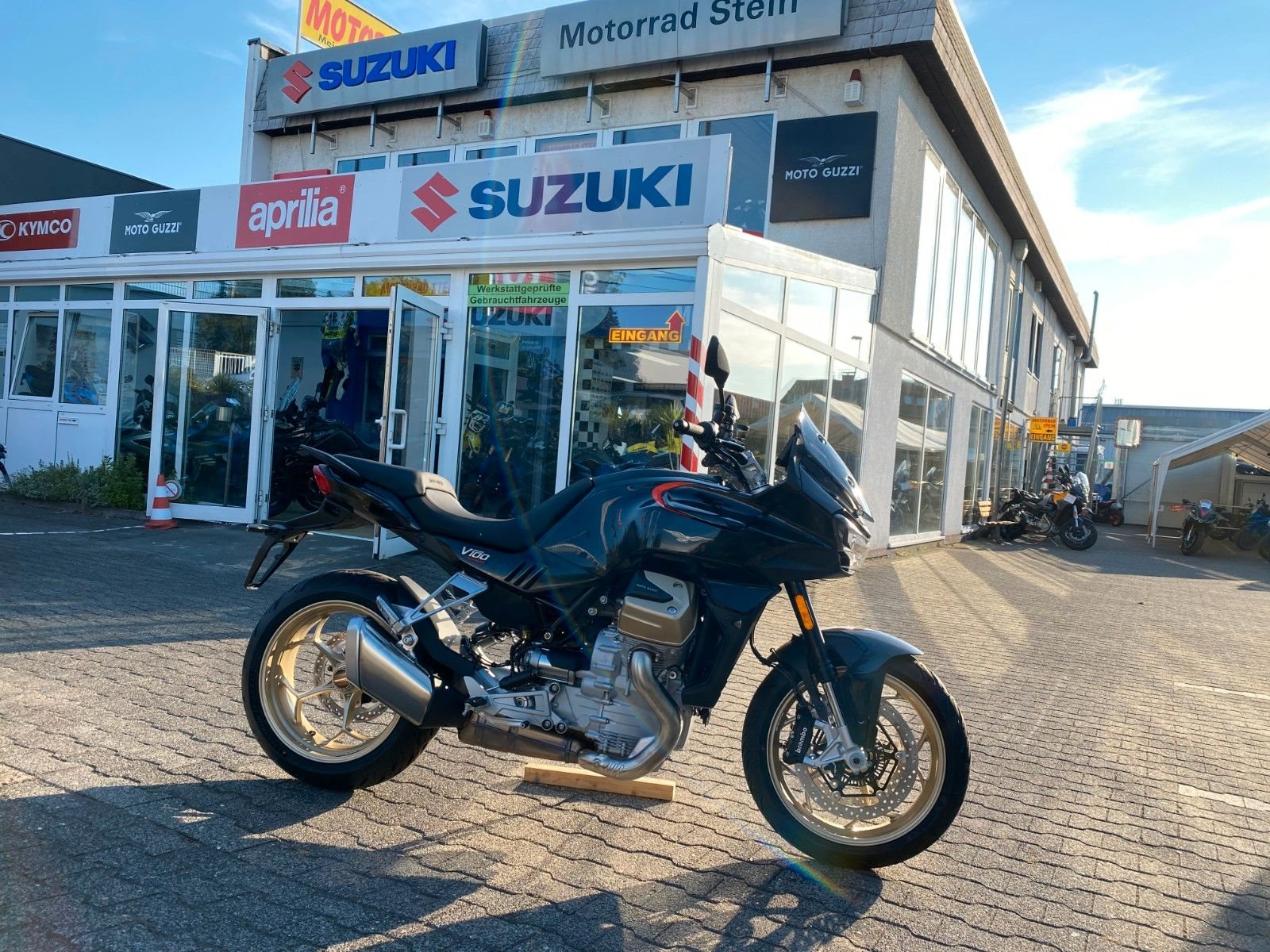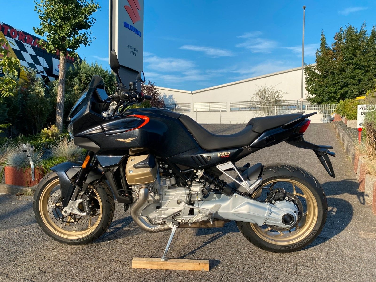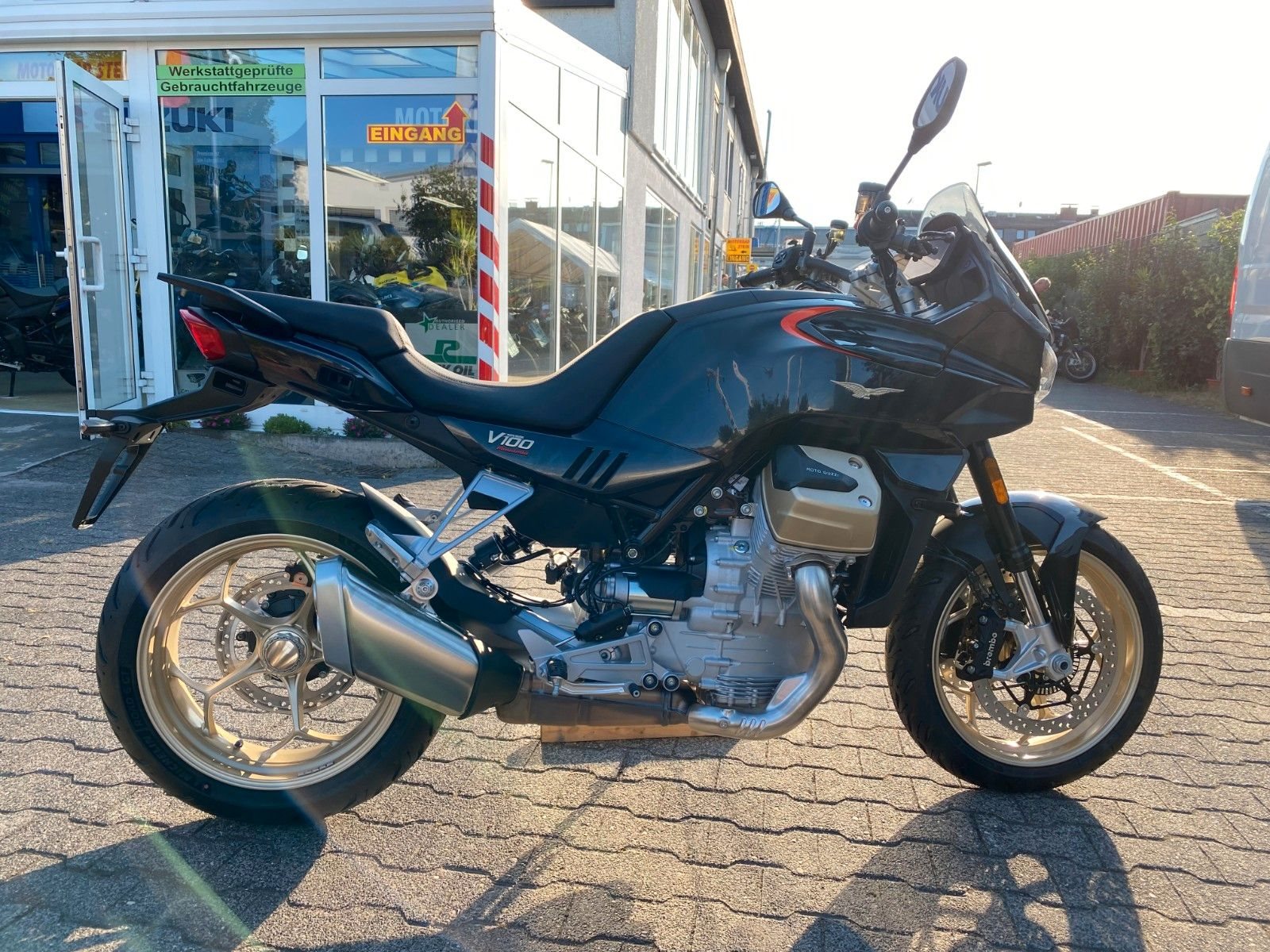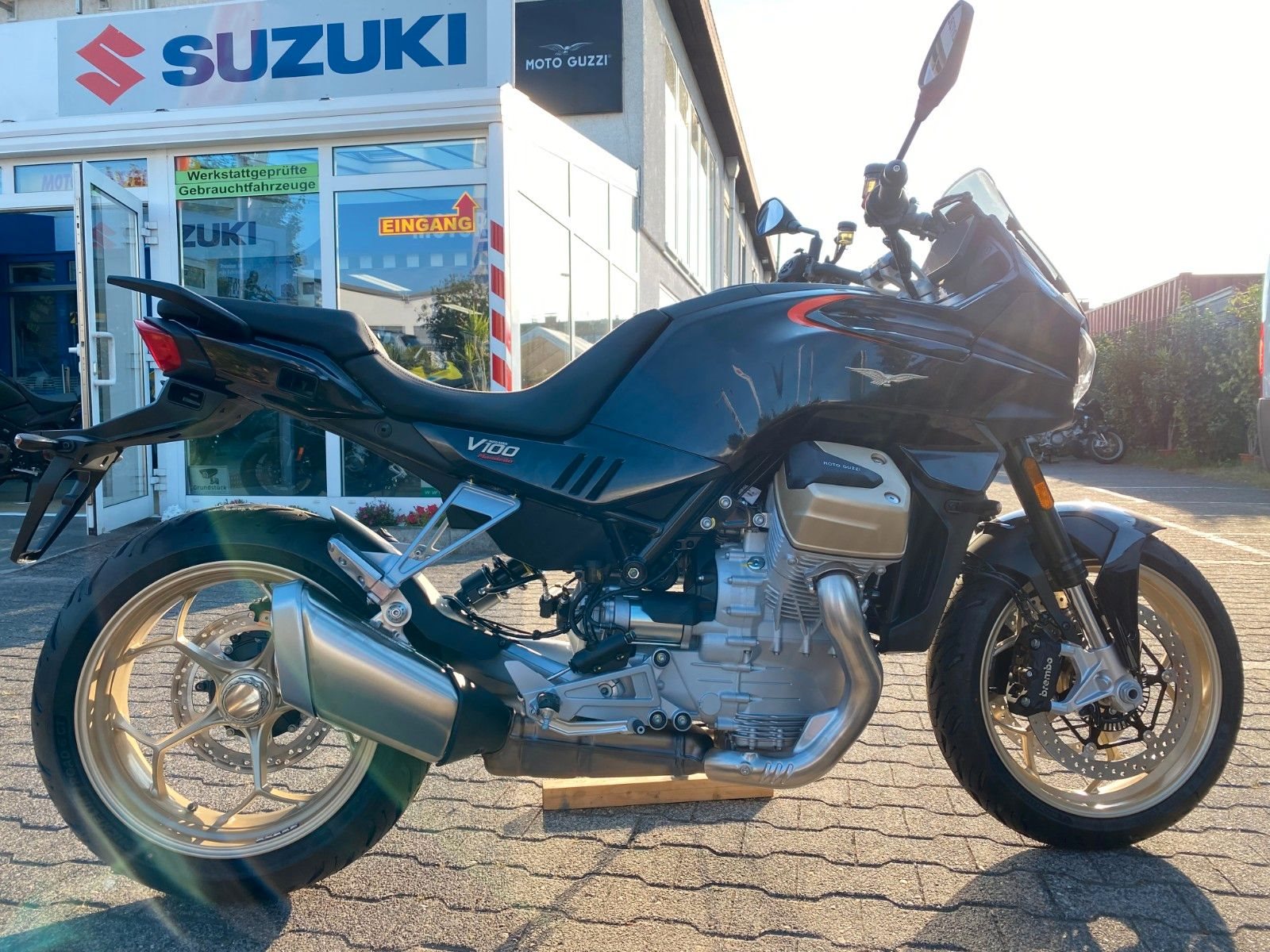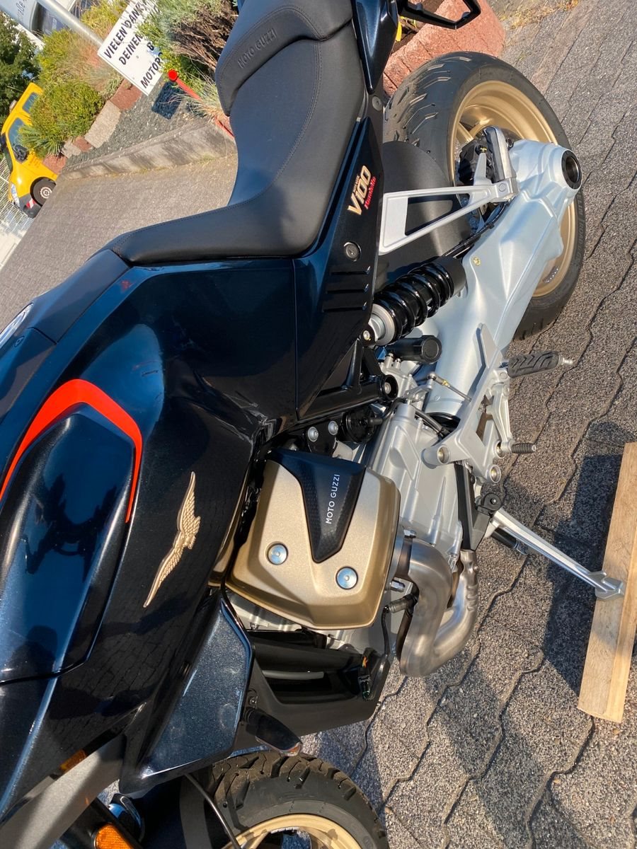 Sind Sie bereit für ein vollkommen neues Kapitel Motorradgeschichte?Die V100 Mandello ist die perfekte Symbiose zwischen den dynamischen Qualitäten eines Roadsters und dem Komfort eines vollwertigen Tourers. Sie lässt jede Kurve zu einem Hochgenuss werden und garantiert Fahrer und Beifahrer auch auf langen Touren ein Höchstmaß an Komfort. On top bietet die V100 eine Vielzahl neuester Technologien, wie das bisher einzigartige adaptive Aerodynamiksystem, die einen einzigartigen Schritt in die Zukunft ankündigen.