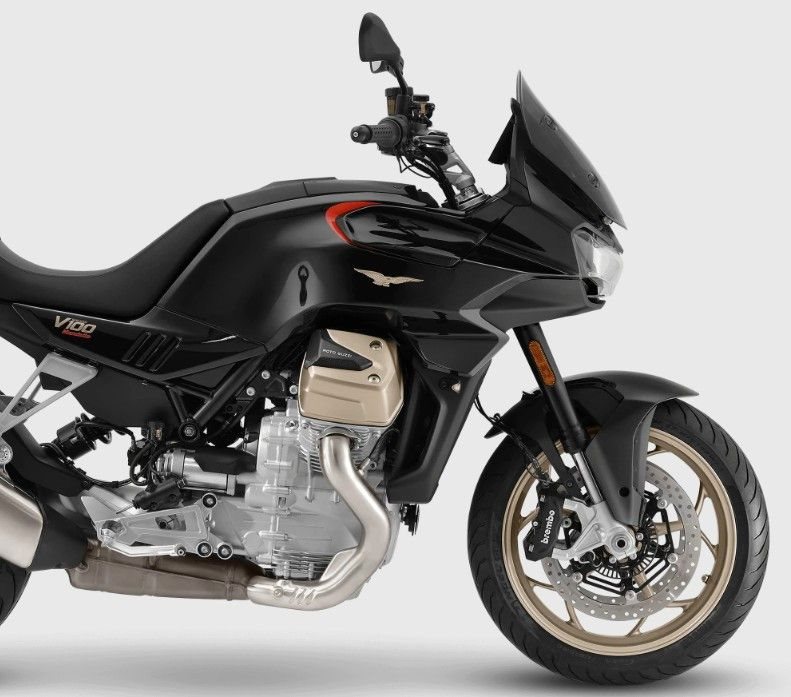 Die V100 Mandello ist die erste Moto Guzzi, die von dem neuen "Compact-Block"-Motor angetrieben wird. Traditionell präsentiert sich der Motor als längseingebauter 90°-V2, bei der V100 Mandello erstmals mit Flüssigkeitskühlung und hydraulisch betätigter Mehrscheiben-Ölbad-Kupplung. Leichter, kompakter und um 103 mm kürzer als der "Small Block" der V85 TT präsentiert sich der 1.042 cm V2-Motor mit satten 115 PS bei 8.800 U/min und 105 Nm Drehmoment bei 6.750 U/min.