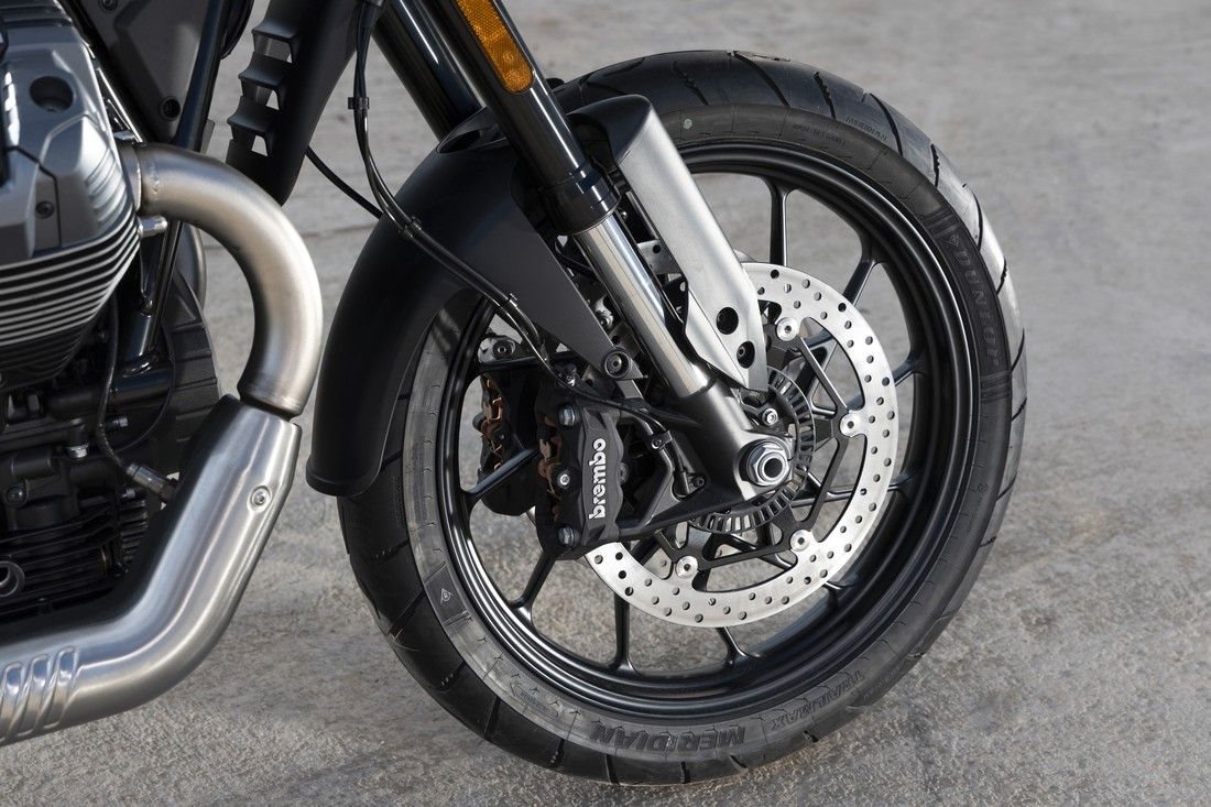 Der Kraftstofftank ist um den klassischen E5+-Zweizylinder mit variabler Steuerung herum geformt, und das Tagfahrlicht zeichnet die Silhouette eines Adlers nach. Das hintere Ende ist verjüngt, während der vordere Bereich durch einen niedrigen Fender definiert ist.