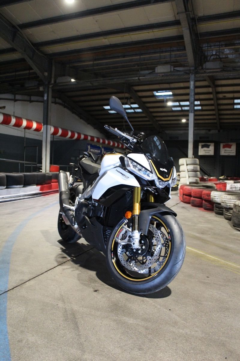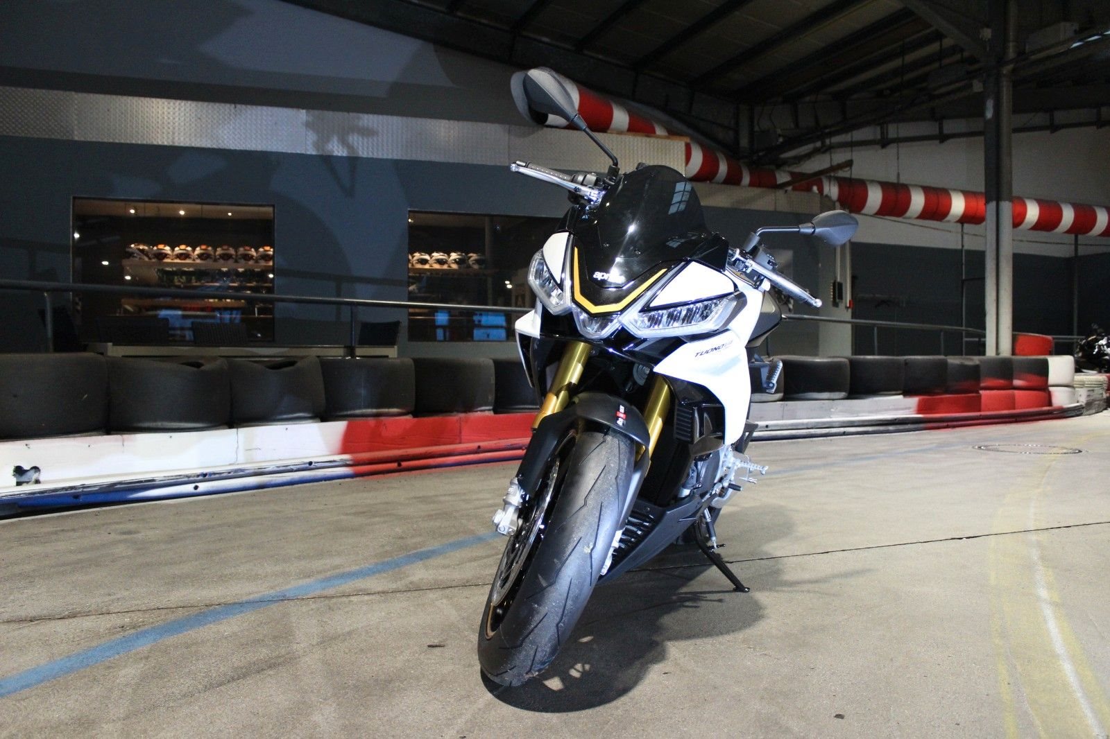 Wie eh und je startet die Tuono V4 Factory mit sportlich, aggressiver Lenkerposition durch.