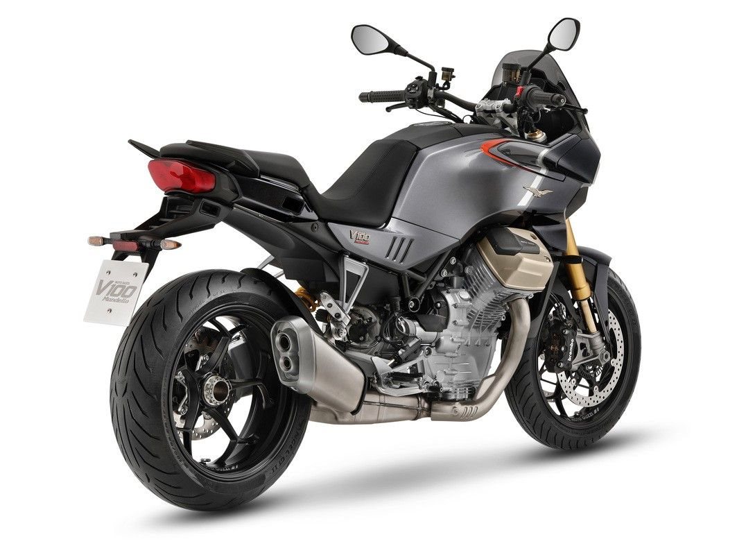 Die V100 Mandello ist die erste Moto Guzzi, die von dem neuen "Compact-Block"-Motor angetrieben wird. Traditionell präsentiert sich der Motor als längseingebauter 90°-V2, bei der V100 Mandello erstmals mit Flüssigkeitskühlung und hydraulisch betätigter Mehrscheiben-Ölbad-Kupplung. Leichter, kompakter und um 103 mm kürzer als der "Small Block" der V85 TT präsentiert sich der 1.042 cm V2-Motor mit satten 115 PS bei 8.800 U/min und 105 Nm Drehmoment bei 6.750 U/min.